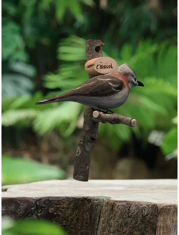 Ave tallada y pintada a mano por artesanos chilenos. Tamaño aprox. 15 cms, con su base de madera colgante alcanza los 30 cms aprox.