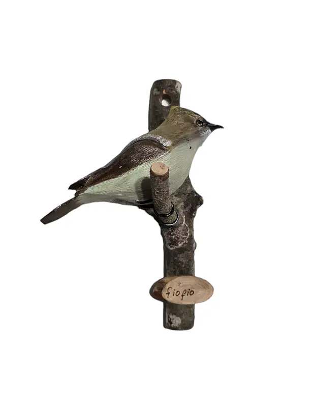 Ave tallada y pintada a mano por artesanos chilenos. Tamaño aprox. 15 cms, con su base de madera colgante alcanza los 30 cms aprox.